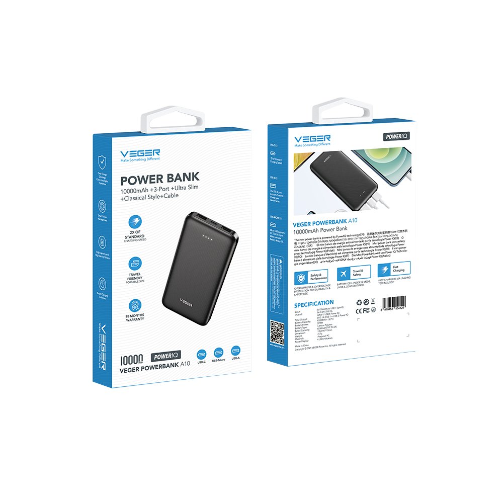 Power bank Veger A10 με χωρητικότητα 10.000 mAh εξασφαλίζει γρήγορη φόρτιση οπουδήποτε και οποτεδήποτε.