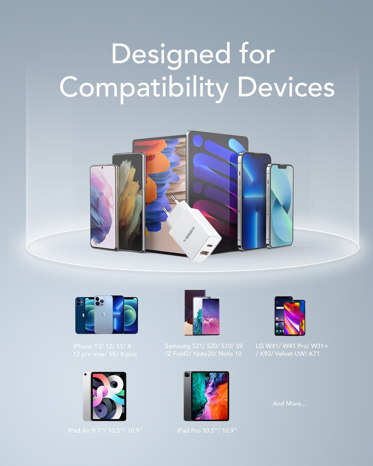 Ο μοναδικός του σχεδιασμός διπλών θυρών, σας επιτρέπει να φορτίζετε γρήγορα το τηλέφωνο και το tablet σας ταυτόχρονα, οποτεδήποτε και οπουδήποτε! Διαθέτει ευρεία συμβατότητα και μπορεί να αντεπεξέλθει στις ανάγκες φόρτισης του MacBook Air 13", σειρά iPhone 14, 13, 12, 11, με τα iPhone XS, XR, SE, X, 8 Plus, AirPods Pro, σειρά iPad, σειρά Galaxy S21, S20, Note20, Note10, S10, S9, σειρά Pixel, Nintendo Switch κ.λπ.